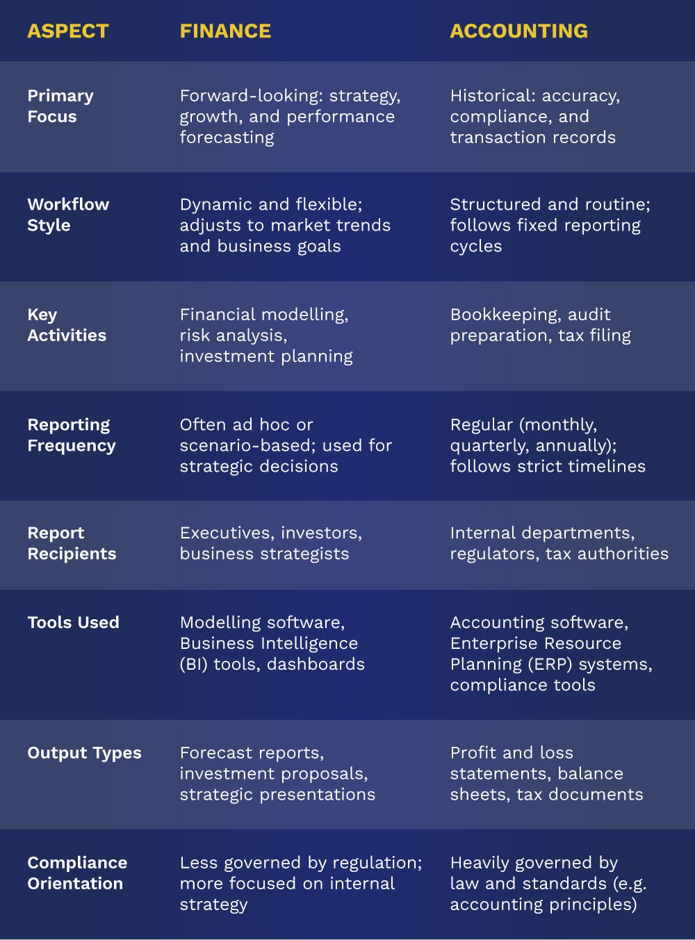 - Focus and Scope: Finance centres on managing assets, growing wealth, and strategic planning. Roles in finance typically involve investment analysis, budgeting and forecasting, and risk assessment to drive long-term growth. In contrast, accounting is more retrospective. It focuses on tracking and reporting past financial activity with strict adherence to accounting principles and financial compliance regulations.